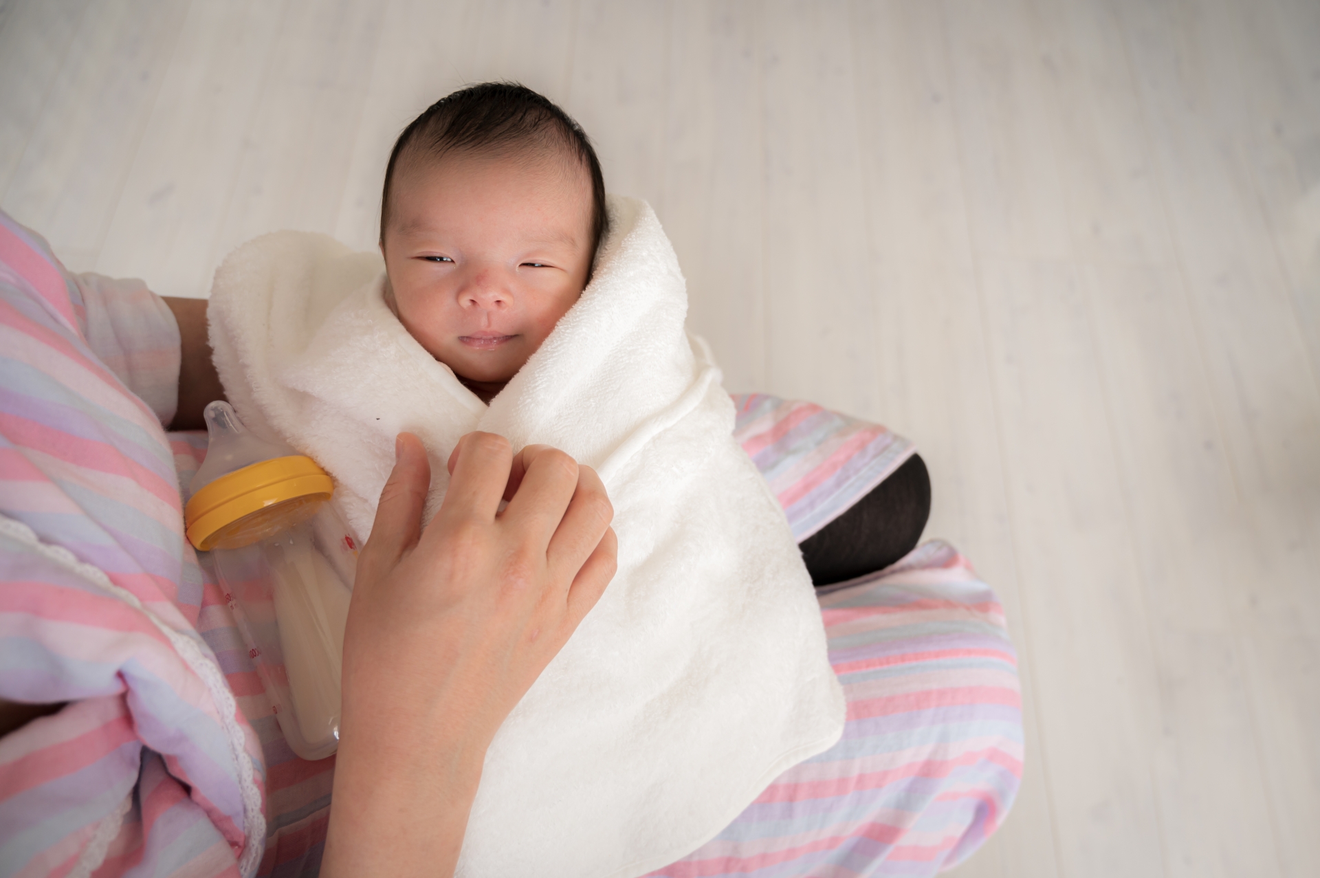 赤ちゃんは、手足がバタつくとその刺激(モロー反射)でさらに泣いてしまうことがあります。 バスタオルやおくるみで、手足をギュッと包む「おひなまき」にしてあげると、子宮の中にいた時の姿勢に近づき、安心して眠ることがあります。